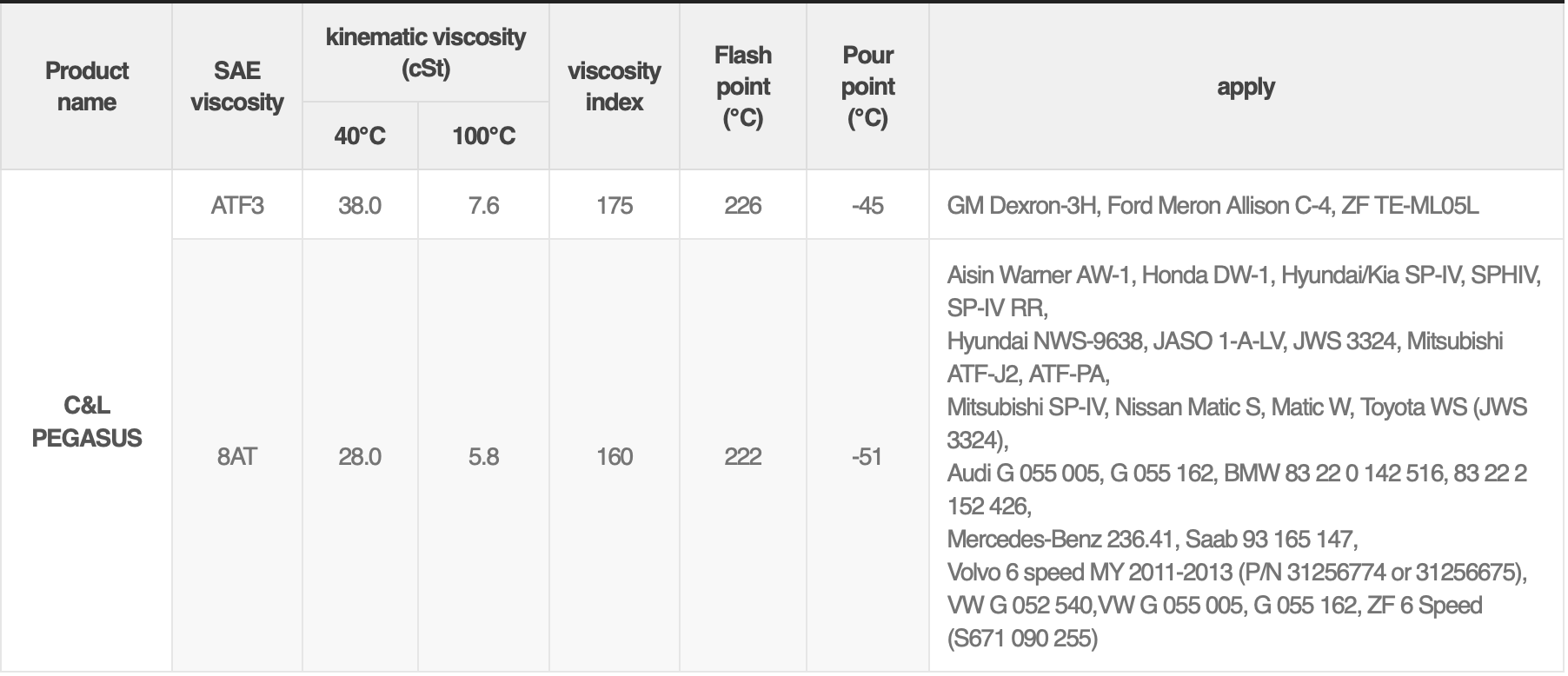C&L PEGASUS 8AT is a premium-grade automatic transmission fluid made from fully synthetic oil. It is formulated to meet the wide range of specifications required by automobile manufacturers in Europe, the United States, and Asia.
