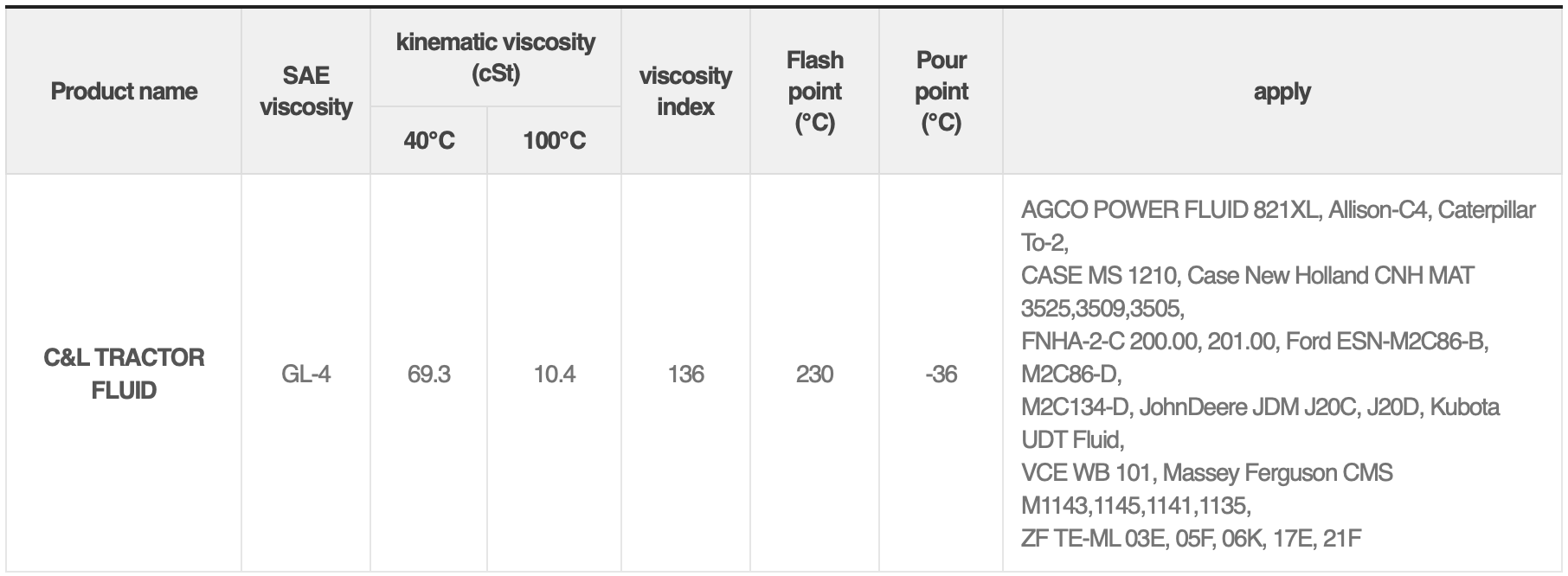 C&L TRACTOR FLUID (UTTO) is a premium tractor oil developed for use in all parts of modern agricultural and industrial tractors, excluding the engine, including hydraulic devices, transmissions, wet brakes, and clutches. It has excellent oxidation stability, wear resistance, and excellent low-temperature viscosity characteristics.