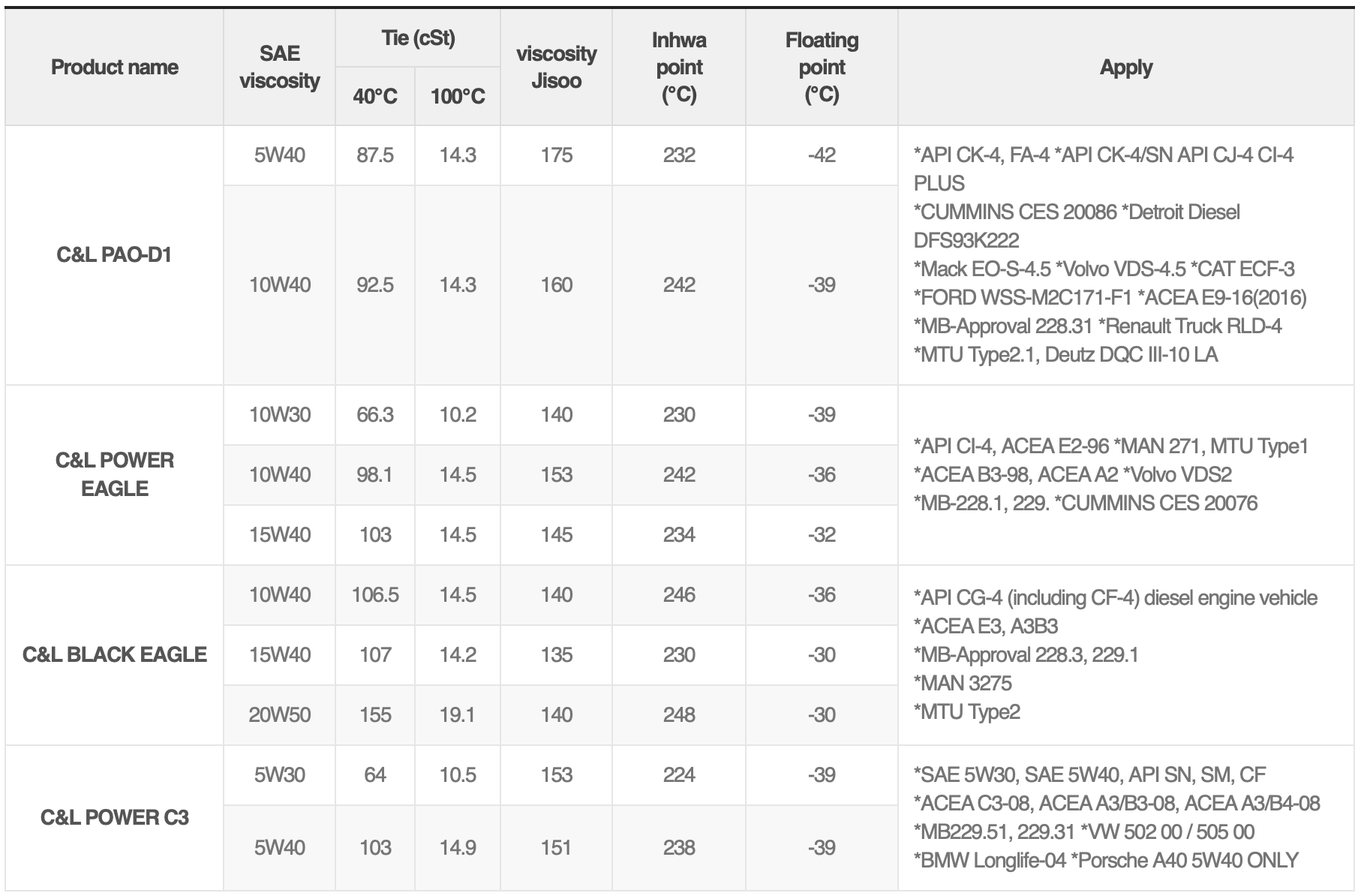C&L POWER EAGLE Diesel Engine Oil is a premium diesel engine oil manufactured primarily with the highest-quality Tri-Synthetic base oil. It not only exceeds API CI-4 ratings but also satisfies European and other diesel vehicle standards. Utilizing superior synthetic base oil and premium additives, it minimizes deposits and carbon buildup within the engine, maintaining optimal engine condition and minimizing oil consumption. Maximizing its effectiveness, it protects the engine, extending its lifespan, and reduces noise to enhance output. This premium diesel engine oil offers exceptional performance.